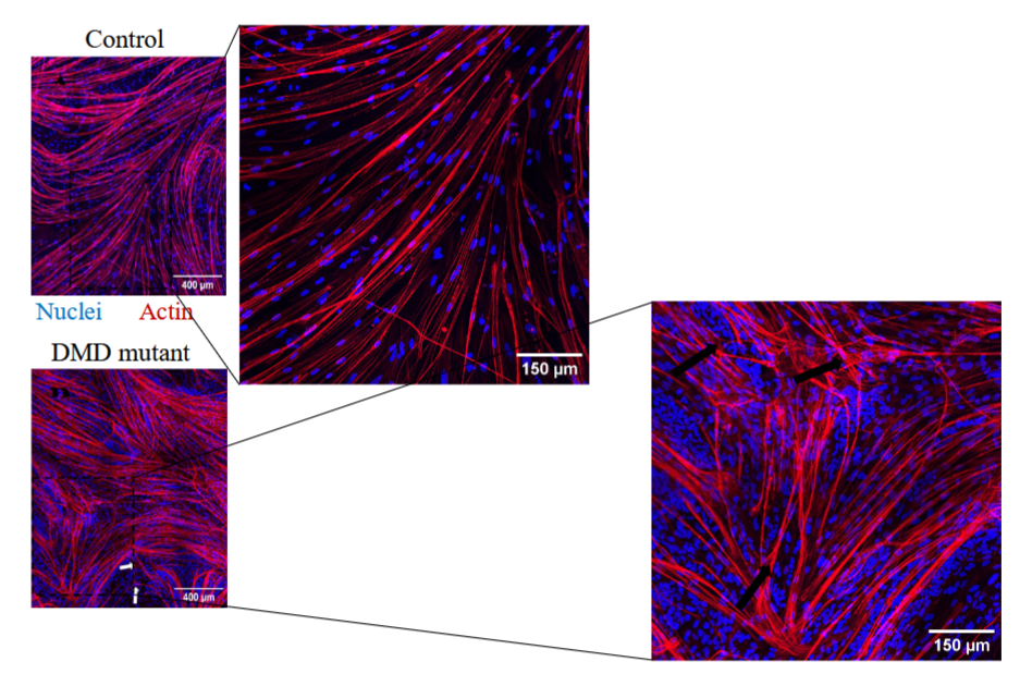• Myotubes chez des patients atteints de dystrophie musculaire et patients sains.